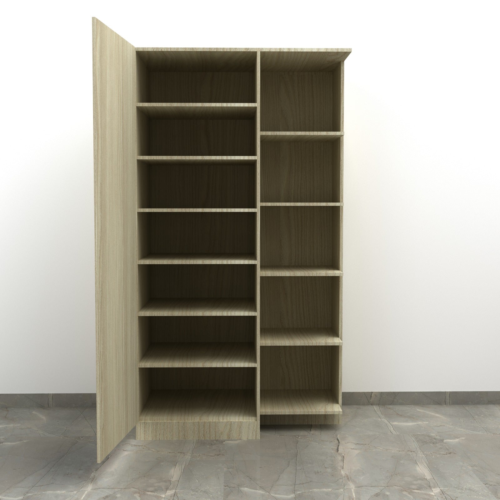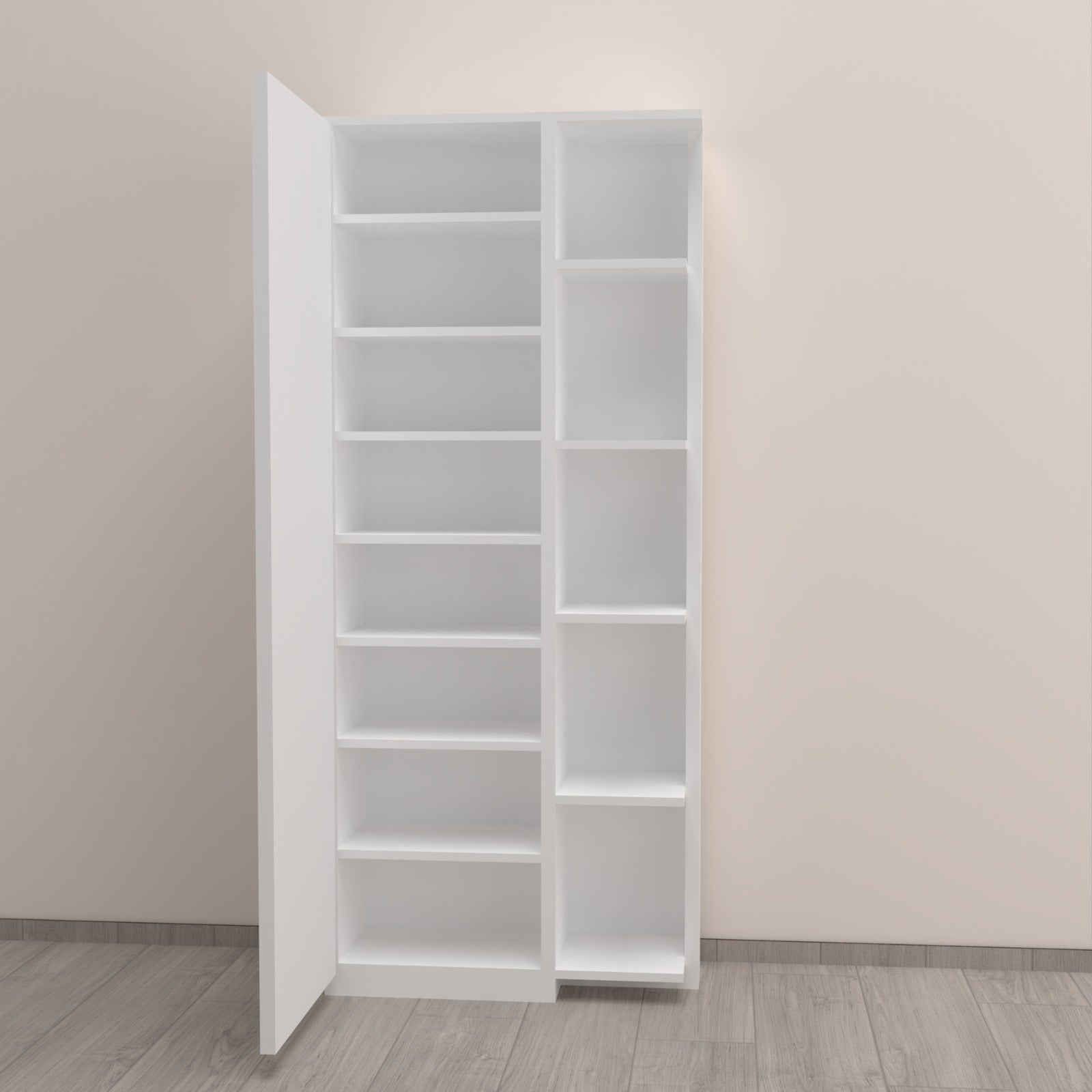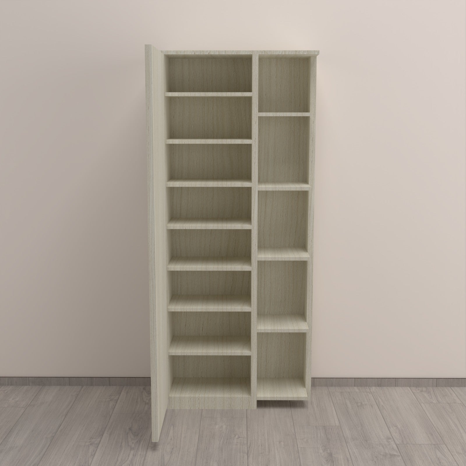 zapatero moderno y elegante con un diseño compacto y funcional. El tamaño del zapatero es de 1.80 metros de alto por 79 cm de ancho y 32 cm de profundidad. Está fabricado en melamina de 18mm, lo que lo hace resistente y duradero.